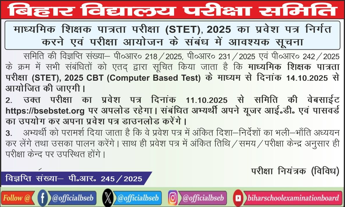 - Bihar STET Examination 2025 Notification Released and Candidate Apply within Last Date.