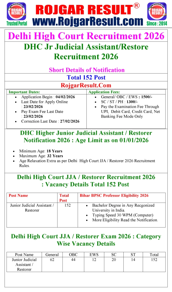 - Delhi High Court DHC Latest Job Recruitment for Junior Judicial Assistant JJA / Restorer Recruitment 2026  Vacancies. Candidate Can Apply Between 04/02/2026 to 23/02/2026 Apply Online.