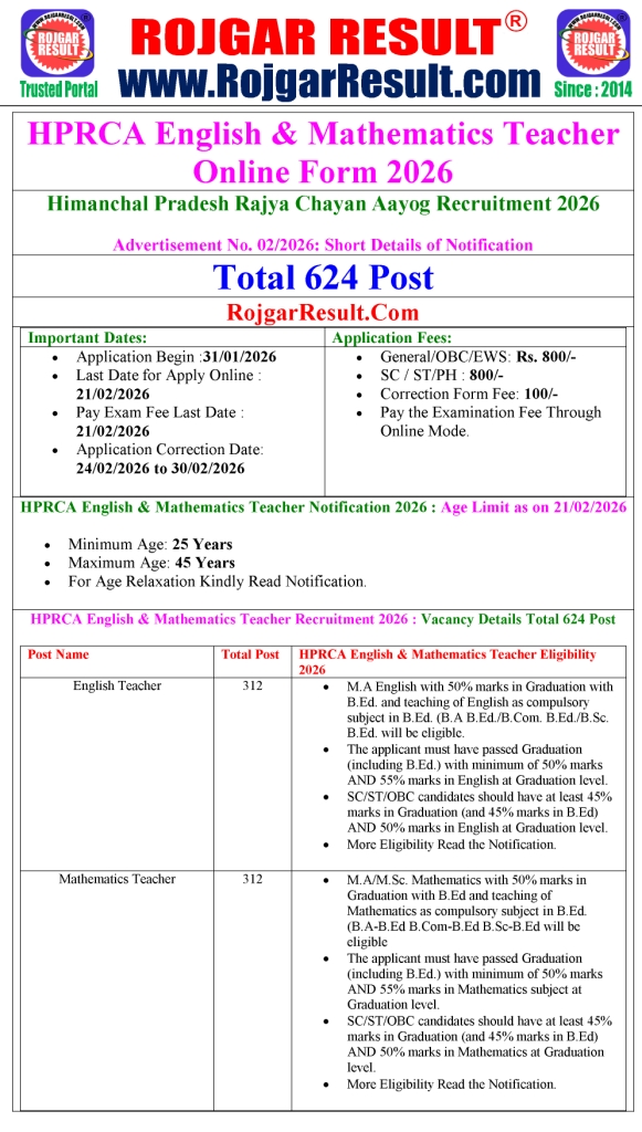 - HPRCA Himanchal Pradesh Rajya Chayan Aayog: has released the notification for the recruitment of English and Mathematics Teacher Purely on Engagement Basic through the official website of Himanchal Pradesh Rajya Chyan Aayog Hamirpur http://hprca.hp.gov.in. Those Candidates Are Enrolled to the Following HPRCA English and Mathematics Teacher Vacancy Can Apply Online from 31/01/2026 to 21/02/2026.