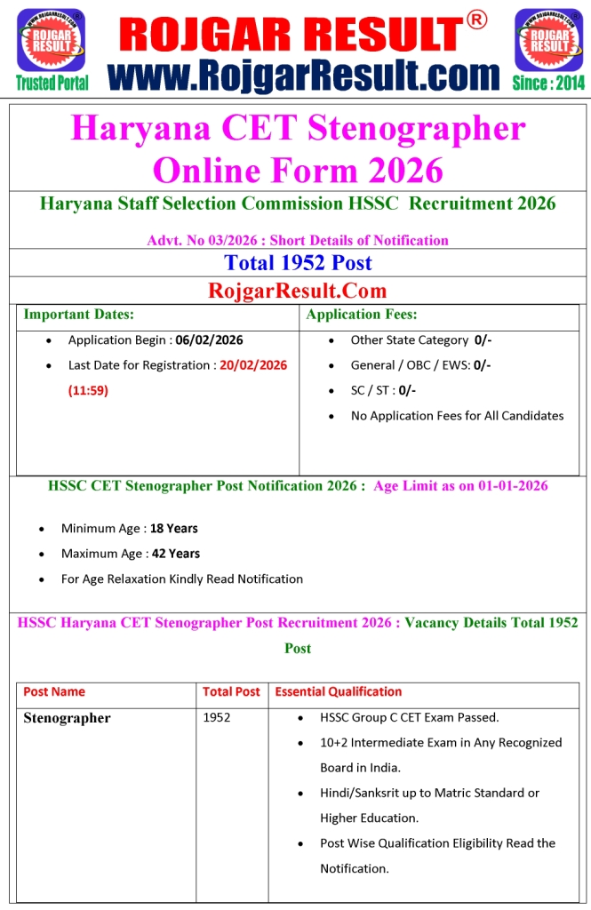 HSSC Haryana CET Stenographer Post Recruitment 2026 : Vacancy Details Total 1952 Post