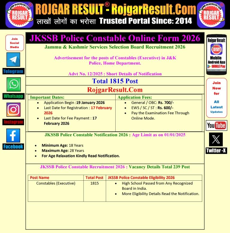 • Short Description: JKSSB Police Constable Recruitment 2026 Apply Online Form : JKSSB Police Constable Post Online Form 2026, Notification has been released on the website @https://jkssb.nic.in/ & Application Form now started on 19 January 2026 to 17 February 2026. Jammu & Kashmir Services Selection Board Jobs 2026. Get the direct link to download notification link available on JKSSB Police Constable Post Vacancy 2026 Official Website and More Other Details Age Limit / Qualification / Vacancy Details / Syllabus / Exam Pattern / Admission and More Other are available on official website & Rojgar Result