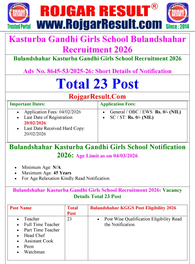 Bulandshahar Kasturba Gandhi Girls School Recruitment 2026: Vacancy Details Total 23 Post