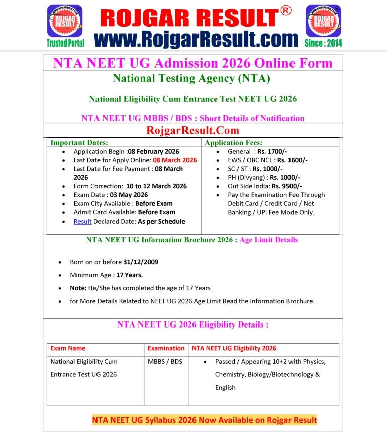 • Short Description: NTA NEET UG 2026 Admissions :  National Testing Agency (NTA) will release the notification for NEET UG 2026, which is conducted for admission to MBBS, BDS and other medical courses in government and private colleges across India. Eligible candidates can apply online once the application window is activated. Candidates are advised to read the complete notification before applying. Official Website and More Other Details Age Limit / Qualification / Syllabus / Exam Pattern / Admission and More Other are available on official website & Rojgar Result