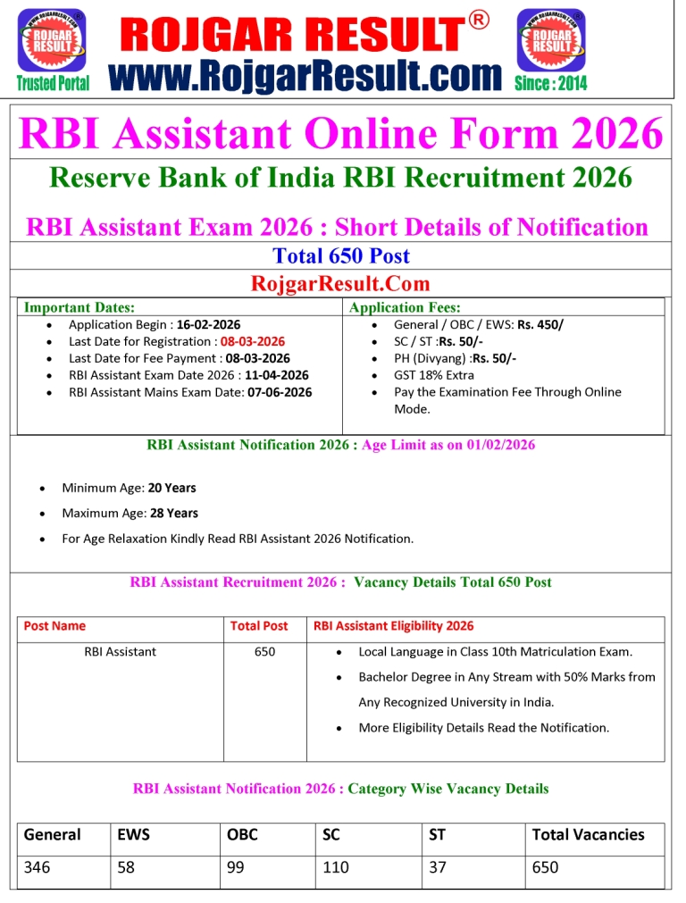 RBI Assistant Recruitment 2026 :Â Vacancy Details Total 650 Post