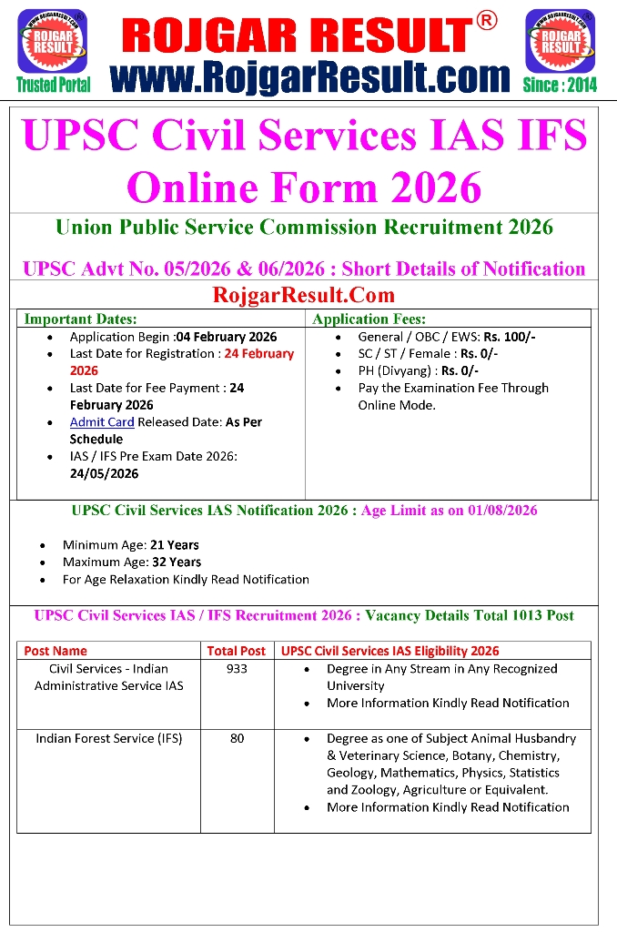 UPSC Civil Services IAS Recruitment 2026 : Vacancy Details Total 1013 Post